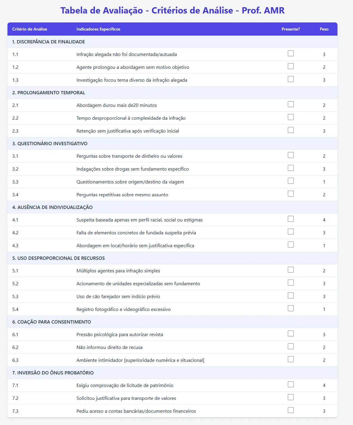 | 9-16 pontos | RISCO MODERADO | Indícios de pretextualidade. Analisar contexto específico e proporcionalidade. |