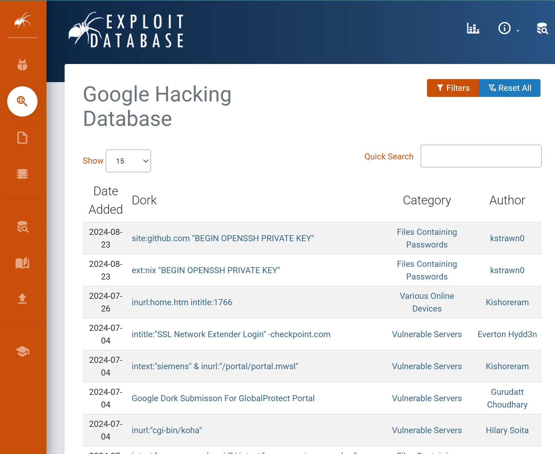 - Exploit Database (EDB): Um arquivo público de exploits, códigos maliciosos e vulnerabilidades. É a organização que mantém e hospeda o Google Hacking Database.