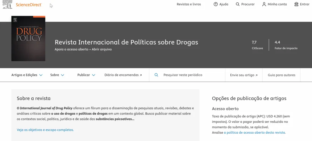 O International Journal of Drug Policy é uma revista acadêmica que serve como um fórum para a disseminação de pesquisas, revisões, debates e análises críticas sobre o uso de drogas e políticas de drogas em um contexto global. A revista busca publicar material que aborde os contextos social, político, jurídico e de saúde das substâncias psicoativas.